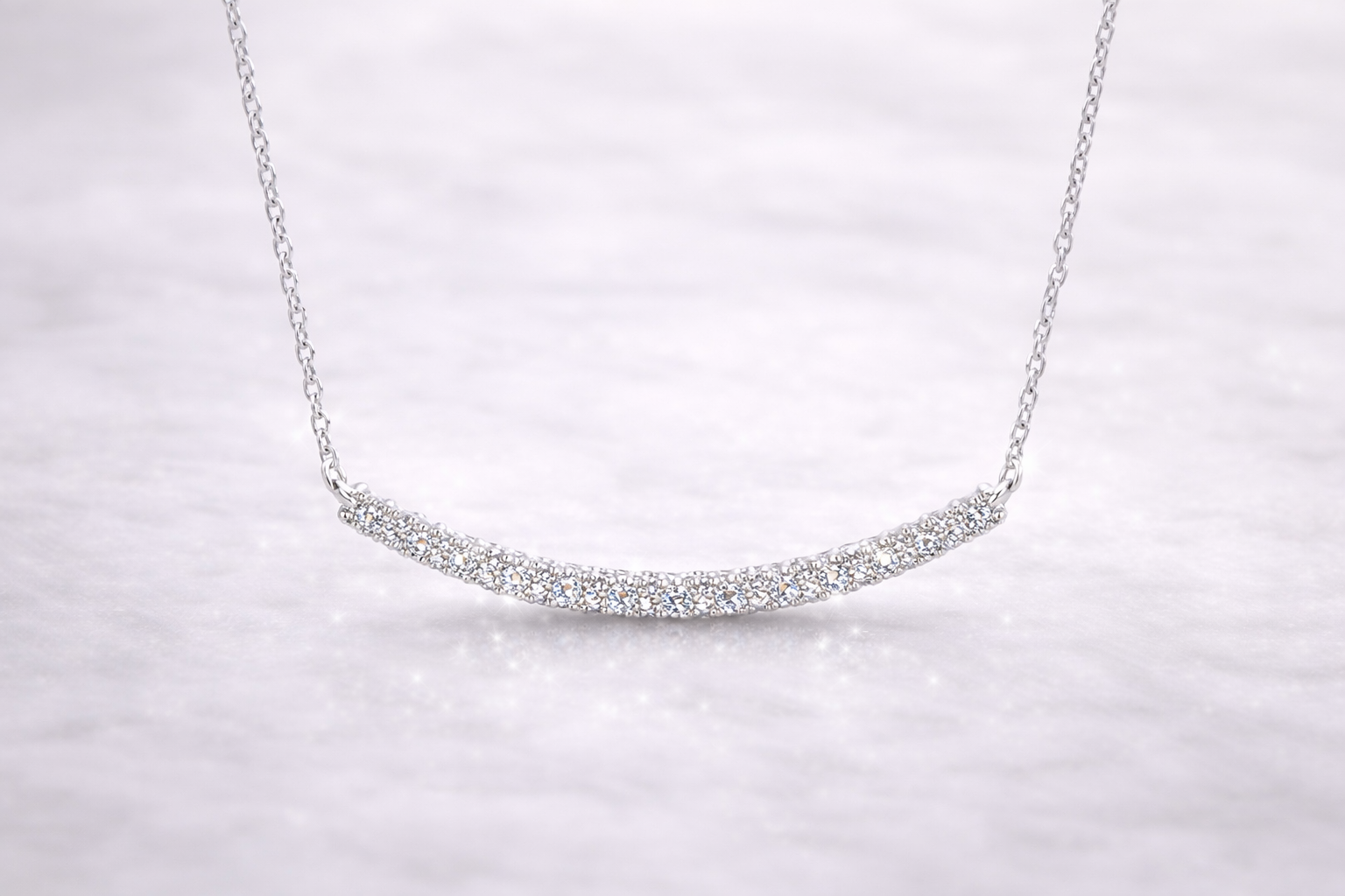 במרכז השרשרת ניצב אלמנט קשת עדין, משובץ באבני Moissanite מרהיבות אבנים יוקרתיות בעלות ברק עמוק, חד ומרשים, המעניק מראה יהלומי נוצץ שנשאר לאורך זמן